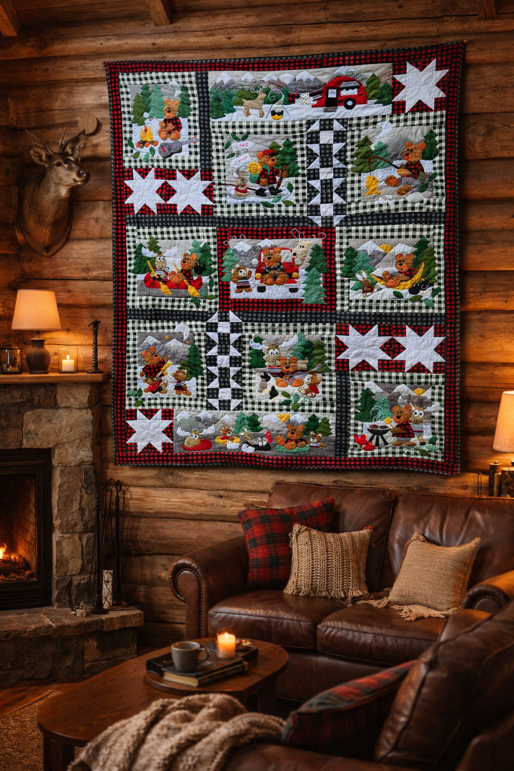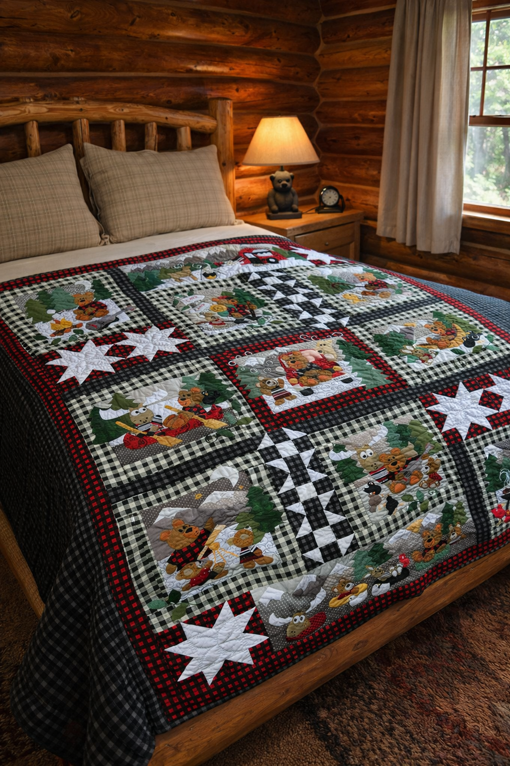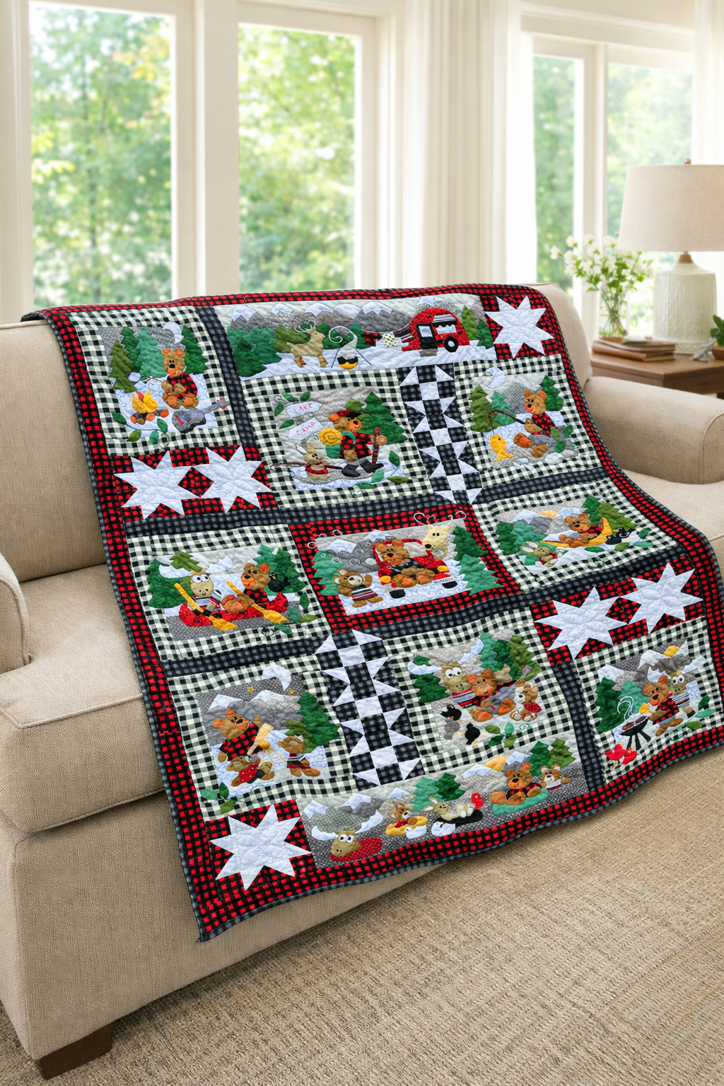 Bearadise features a camping loving bear and his forest friends as they enjoy the great outdoors. This whimsical quilt is fun to put together and will add a sweet homespun touch to your decor! Use plaids in reds, blacks and whites, or make it in your own style!