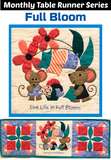 This pattern can be made into a beautiful table runner or a mini quilt for fun monthly decor. Full Bloom features some sweet mice and their laundry, with the saying "Live Life in Full Bloom". The Full Bloom table runner pattern is perfect for May!