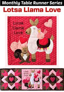 The Lotsa Llama Love Table Runner pattern consists of two pieced blocks and a center applique block. The 11 page digital pattern contains instructions for both the table runner and mini quilt using the applique block. Also included are full sized templates and finishing instructions!