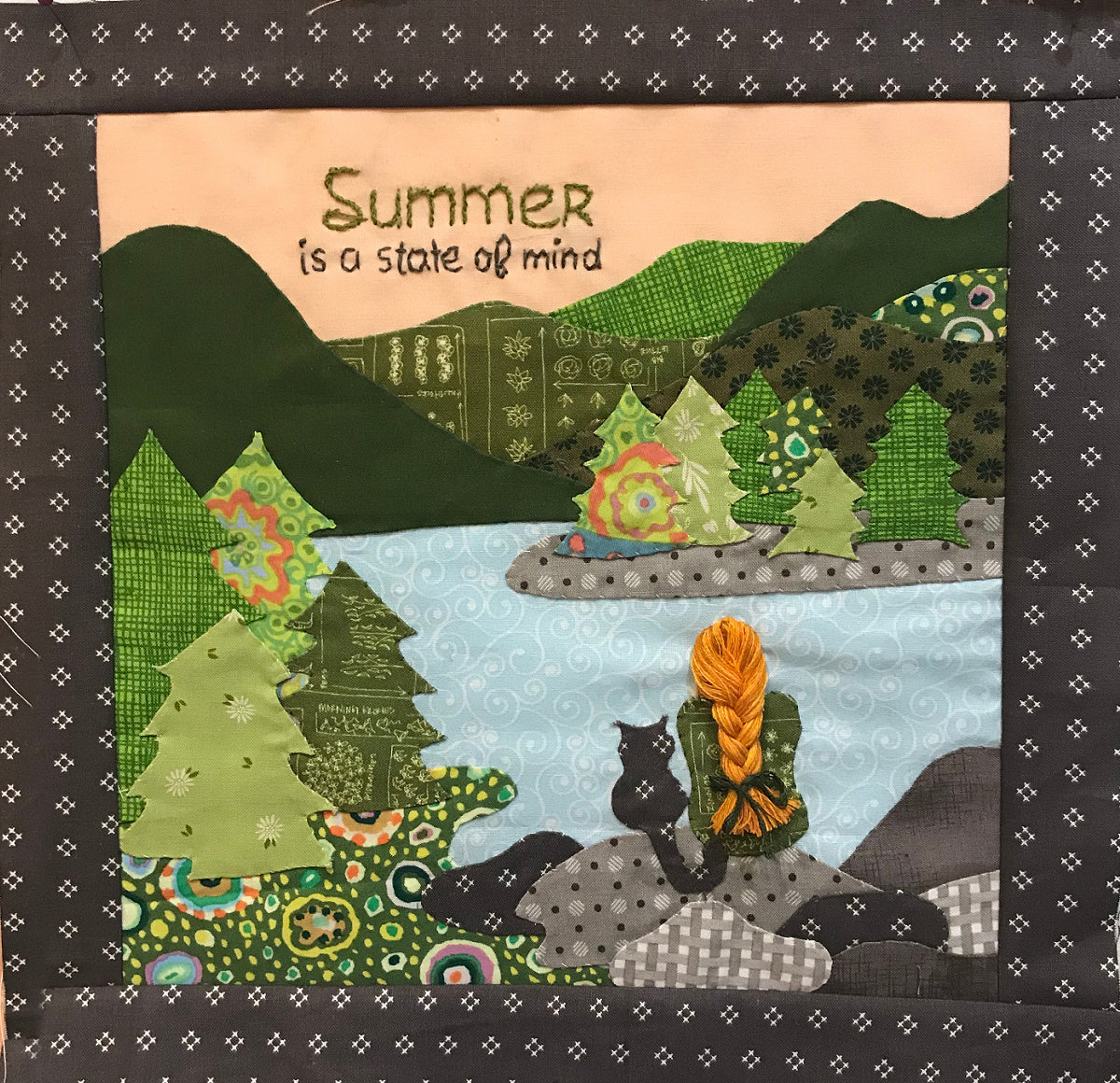 Summer Pines is perfect for June. Or display year round! This pattern features a girl and her cat enjoying the beautiful summer scenery. Full instructions are included for the hand embroidered hair. This pattern includes applique and just a touch of hand embroidery and includes all templates and instructions to complete five different projects.