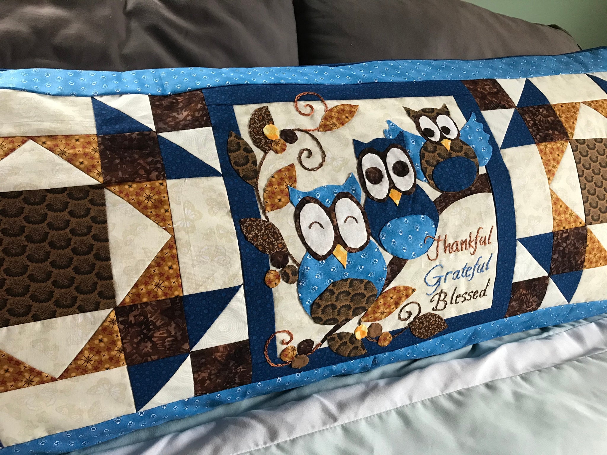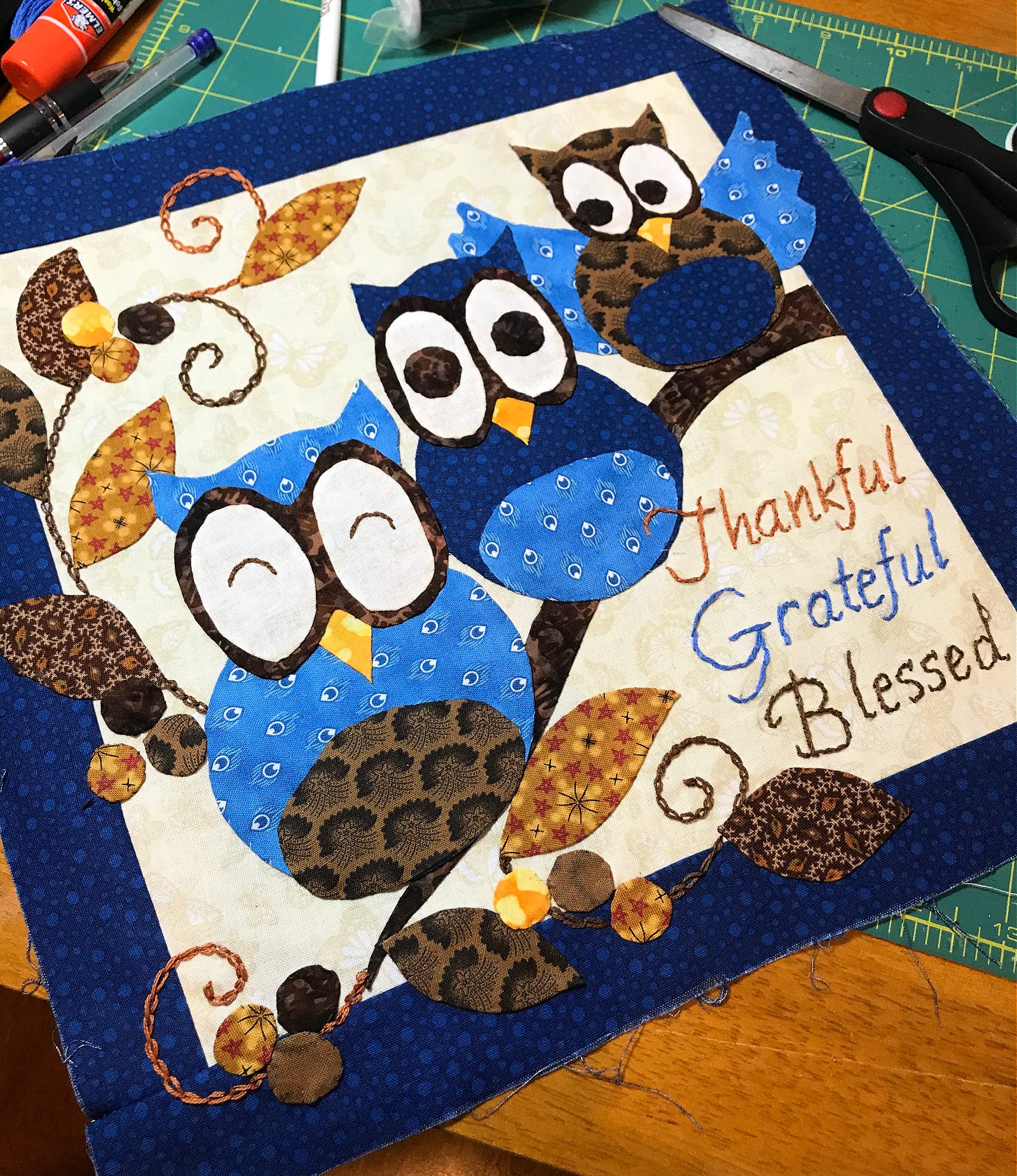 Thankful and Blessed is perfect for November. Or display year round! This pattern features three whimsical owls and the saying, "Thankful, Grateful and Blessed". This pattern includes applique and just a touch of hand embroidery and includes all templates and instructions to complete four different projects.