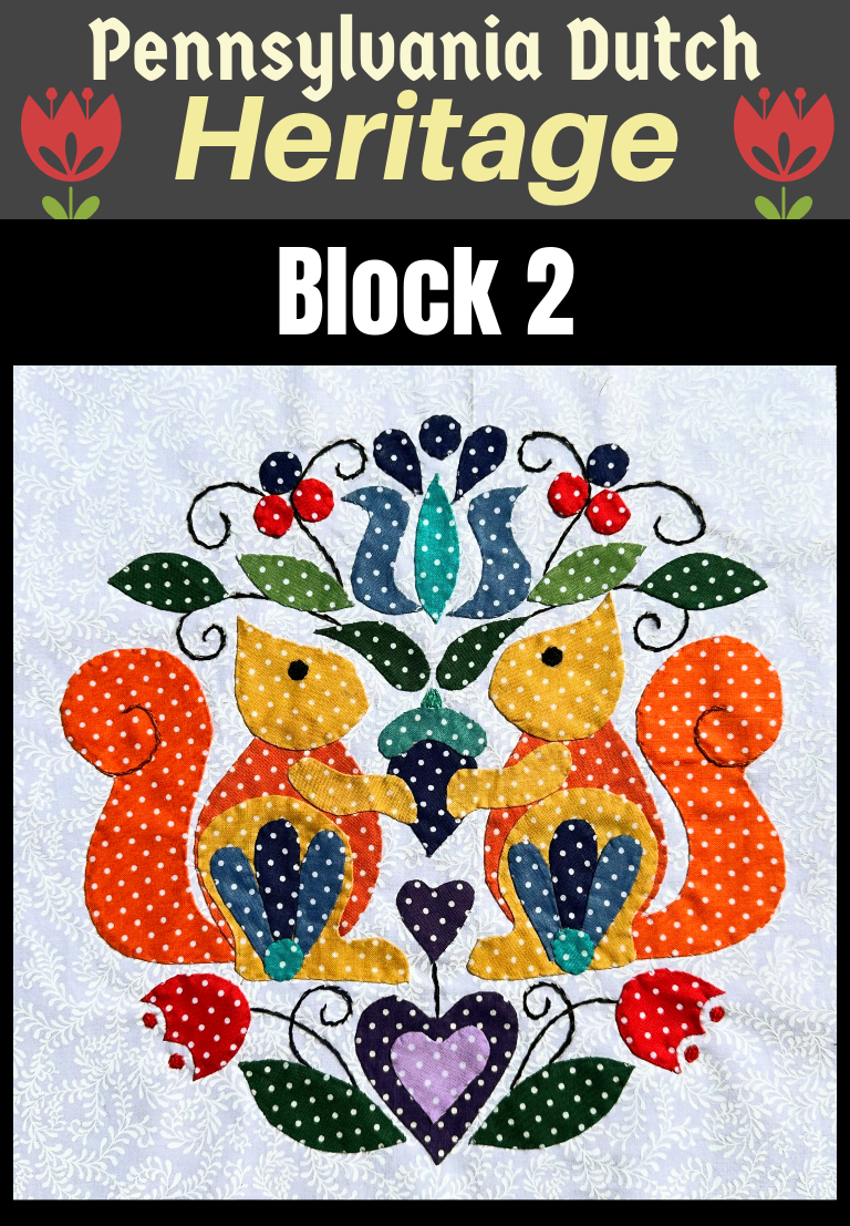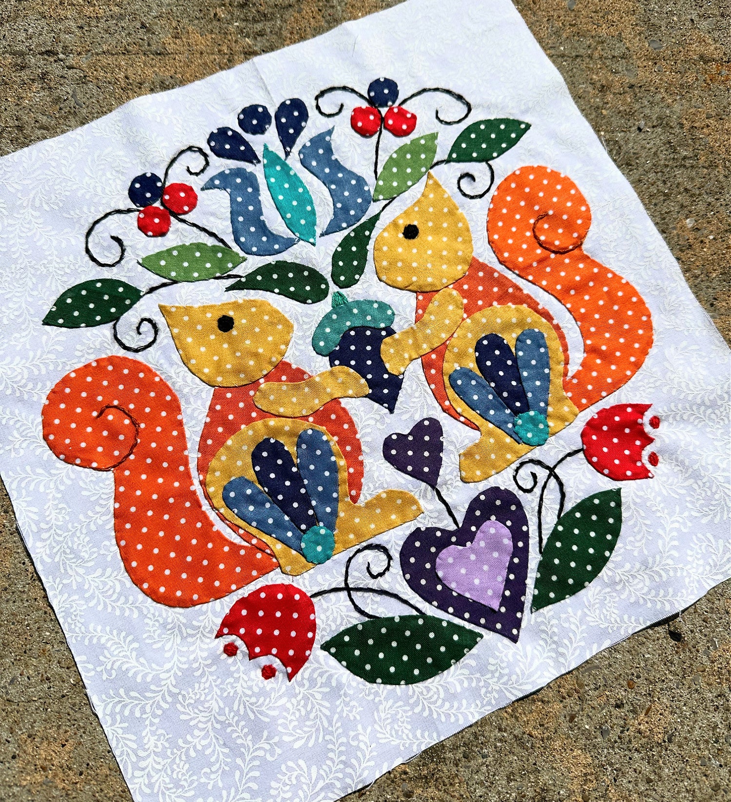 Block 2 measures 12" x 12" when finished and features two squirrels and flowers. Block 2 is an 8 page downloadable pdf pattern which includes full instruction for this block, full sized templates and embroidery stitch suggestions, along with instructions for the filler blocks.