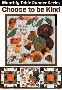This pattern can be made into a beautiful table runner or a mini quilt for fun monthly decor. Choose to be Kind features a sweet squirrel and mouse sharing an acorn, with the saying "Choose to be Kind". The Choose to be Kind table runner pattern is perfect for September!