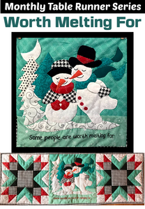 This pattern can be made into a beautiful table runner or a mini quilt for fun monthly decor. So let’s start with some winter snowmen. The Worth Melting For table runner pattern is perfect for January!