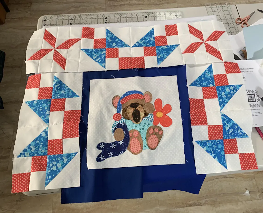 Beary Sleepy Baby Quilt features a yawning little bear in cozy pajamas, designed with simple piecing and approachable applique techniques. This pattern is suitable for confident beginners and experienced quilters alike, with clear instructions and thoughtful construction that make the process enjoyable from start to finish.