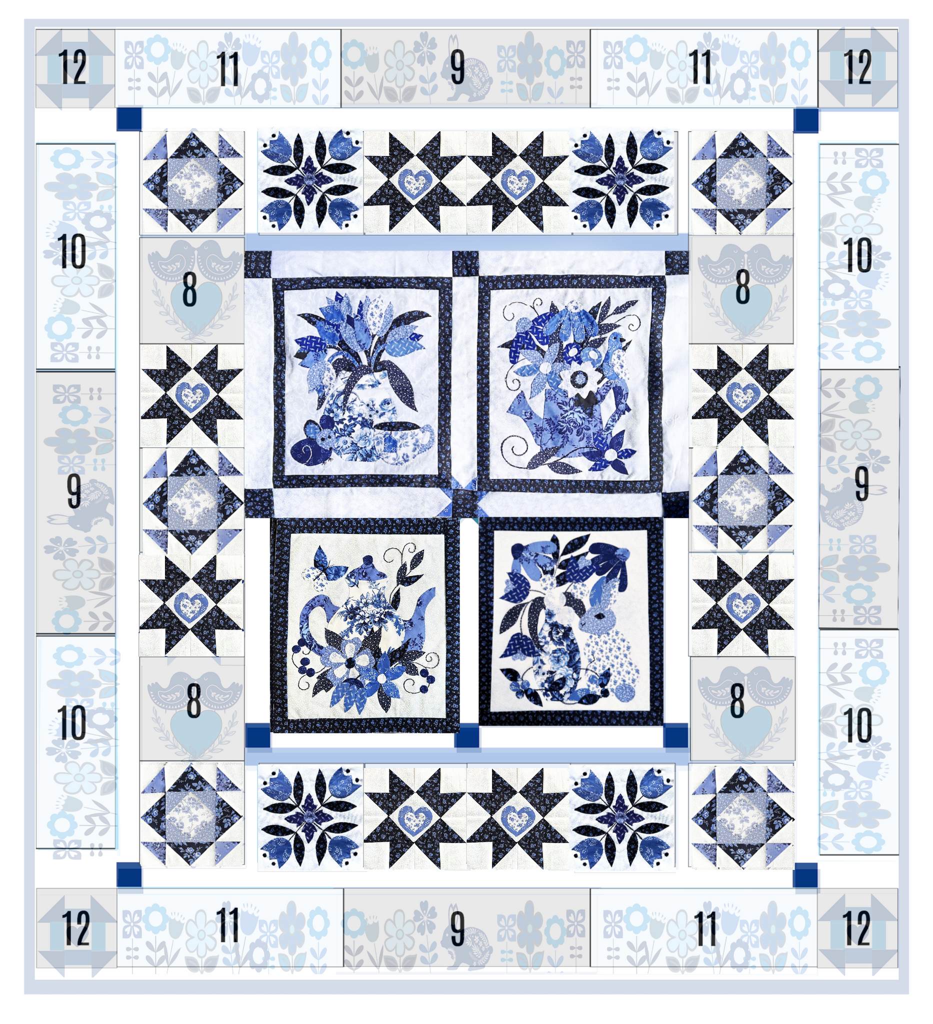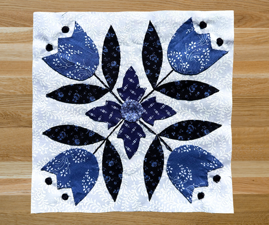 This beautiful applique pattern is inspired by delft pottery and features many shades of blue and white.  Make it in blues, or experiment with color.  Either way, it will sure to become an heirloom quilt!